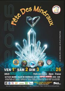 Le week-end du 1er mai 2026, pour sa 12ème année, la FETE DES MINERAUX de l’Oisans propose au Bourg d’Oisans un programme authentique et ludique et vous attend avec impatience pour partager votre passion en ce haut lieu minéralogique !