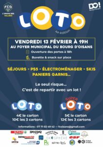 Le loto du FC Oisans fait son grand retour pour une nouvelle édition dédiée au jeu, au partage et à la convivialité. Un rendez-vous intergénérationnel où se mêlent excitation et bonne humeur. De nombreux lots attractifs seront à gagner, faisant de cette soirée un moment attendu et apprécié par tous.