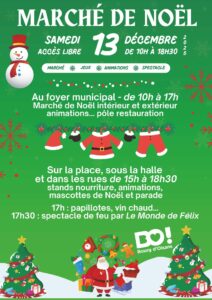 De 10h à 18h30, au foyer municipal, sur la place du village et dans les rues du centre : Marché de noël, stands de restauration éphémères, nombreuses animations pour enfants, spectacle de feu et déambulations lumineuses en fin de journée !