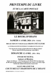 Le Dimanche 12 Avril de 10 H 00 à 18 H 00 présence d’auteurs, poètes, illustrateurs, salon réservé aux écrivains (historiens et romanciers}, illustrateurs et poètes, aux associations littéraires (telle celle des Amis de ! »Histoire du pays vizillois), avec également la présence de deux libraires, dont la Librairie des Alpes de Grenoble. L’après-midi, projection sur écran d’un diaporama inédit faisant découvrir, à travers les cartes postales de 1900 à 1965 l’évolution urbaine des villages de Mont de-Lans et Venosc et de la station des DEUX-ALPES. Présentation par Bernard FRANCOIS).