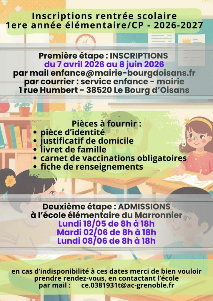 Inscriptions rentrée scolaire élémentaire CP rentrée 2026/2027 Fiche d'inscription école élémentaire Le Marronnier La nouvelle école élémentaire du Bourg d'Oisans